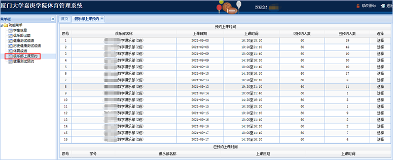点击菜单“俱乐部上课预约”可进行上课时间的选择预约。如下图:
