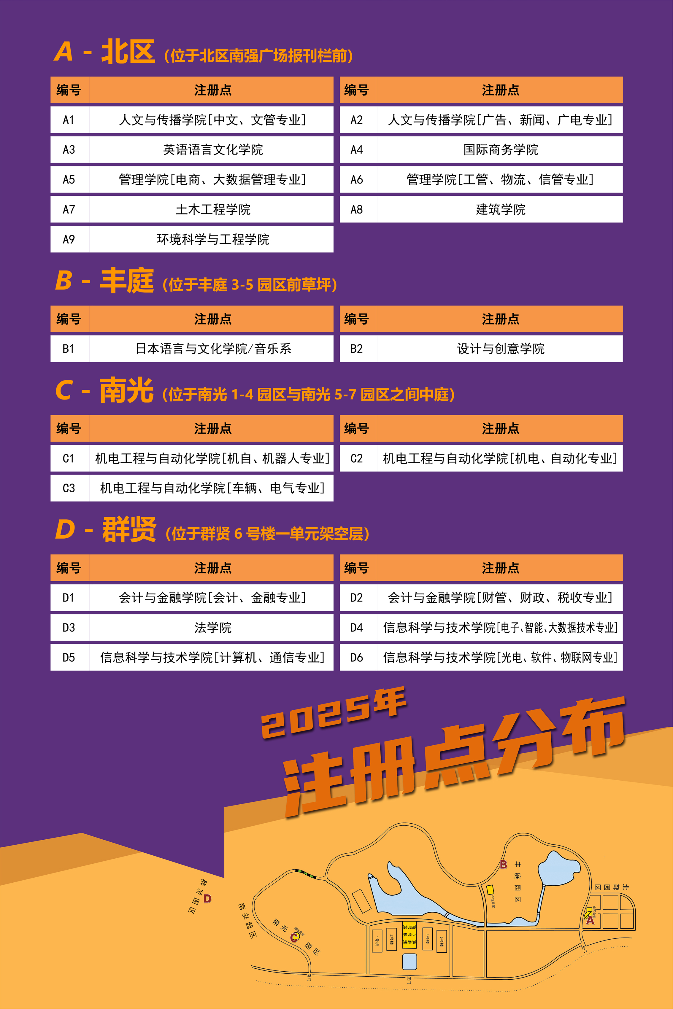 注册 | 9月2日 | 按照迎新工作人员引导,到所在院系、专业注册点凭《录取通知书》注册(强烈建议将《录取通知书》放在随身包袋,注册时无需出示其他个人材料),并领取校园卡。9月2日后报到的新生,请到主楼群3号楼612教务部学务管理中心办理注册手续。 相关链接:《普通本科新生注册流程》《2025年普通本科新生注册点分布》 |