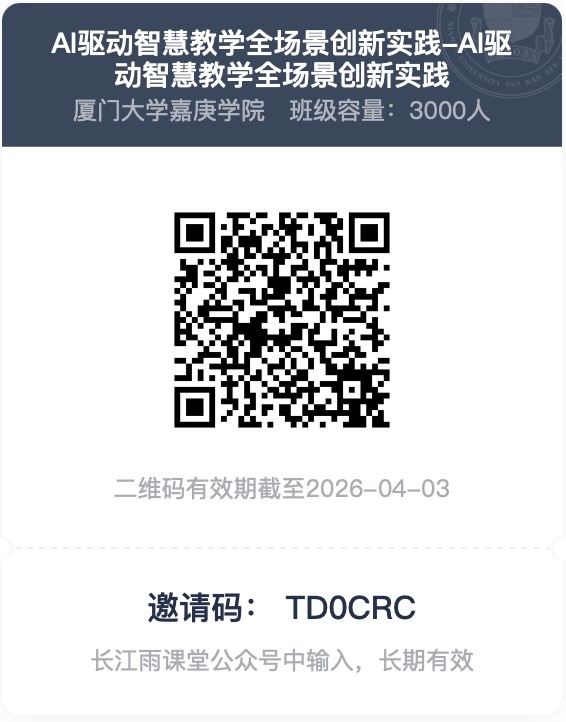 微信扫描二维码,或在“雨课堂”公众号中输入班级邀请码“TD0CRC”,进入专属班级观看直播并参与互动。班级二维码有效期至2026年4月3日。